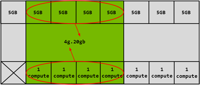 Similarly, 4x5GB memory slices can be combined with 4x1 compute slices to create the 4g.5gb GI profile:
