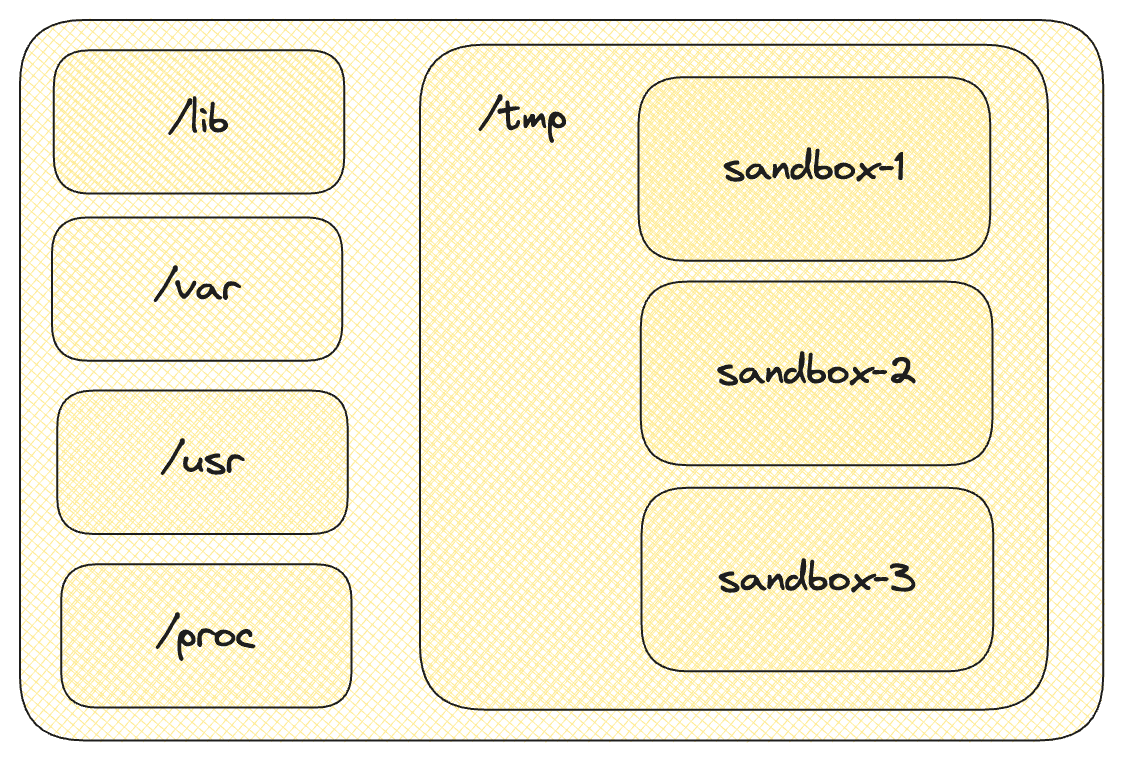 At the file system level, we need to create a virtualized file system for the child processes of the sandbox. This separation isolates the file system of the sandbox host container from the file system of the processes running user code within the sandbox. The main reason for this is that