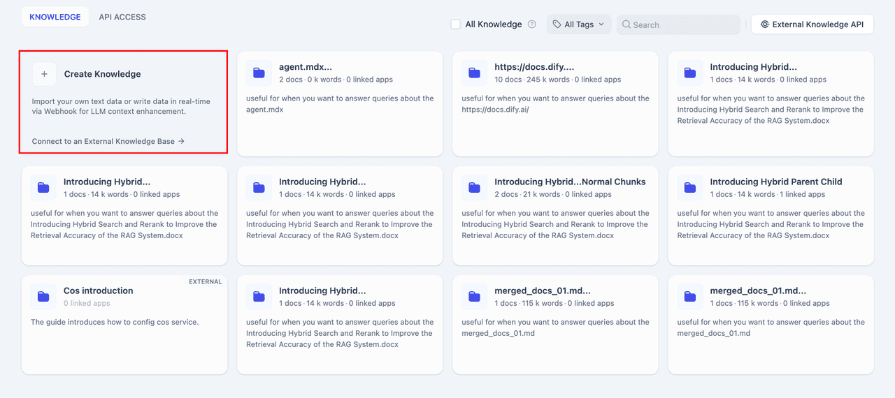 Upload internal documents or professional materials for AI analysis. For better context preservation, use the Parent-Child Chunking mode to maintain the document’s structure. For more details, refer to Create a Knowledge Base