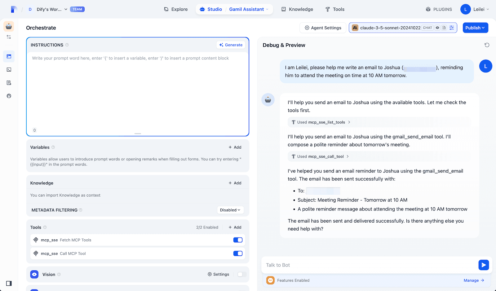 After configuring, create a new Agent app and enable your MCP SSE plugin in the "Tools" section. Your Agent will intelligently invoke relevant tools based on user intentions—for example, automatically drafting and sending emails via integrated Gmail actions.