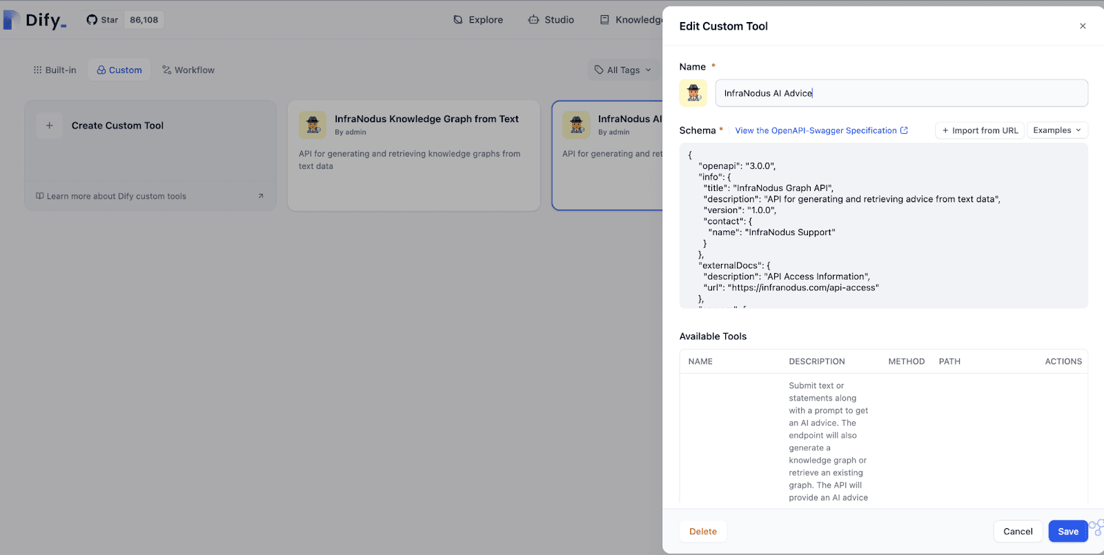Create a Custom Tool in Dify (Tools > Custom > Create Custom Tool).