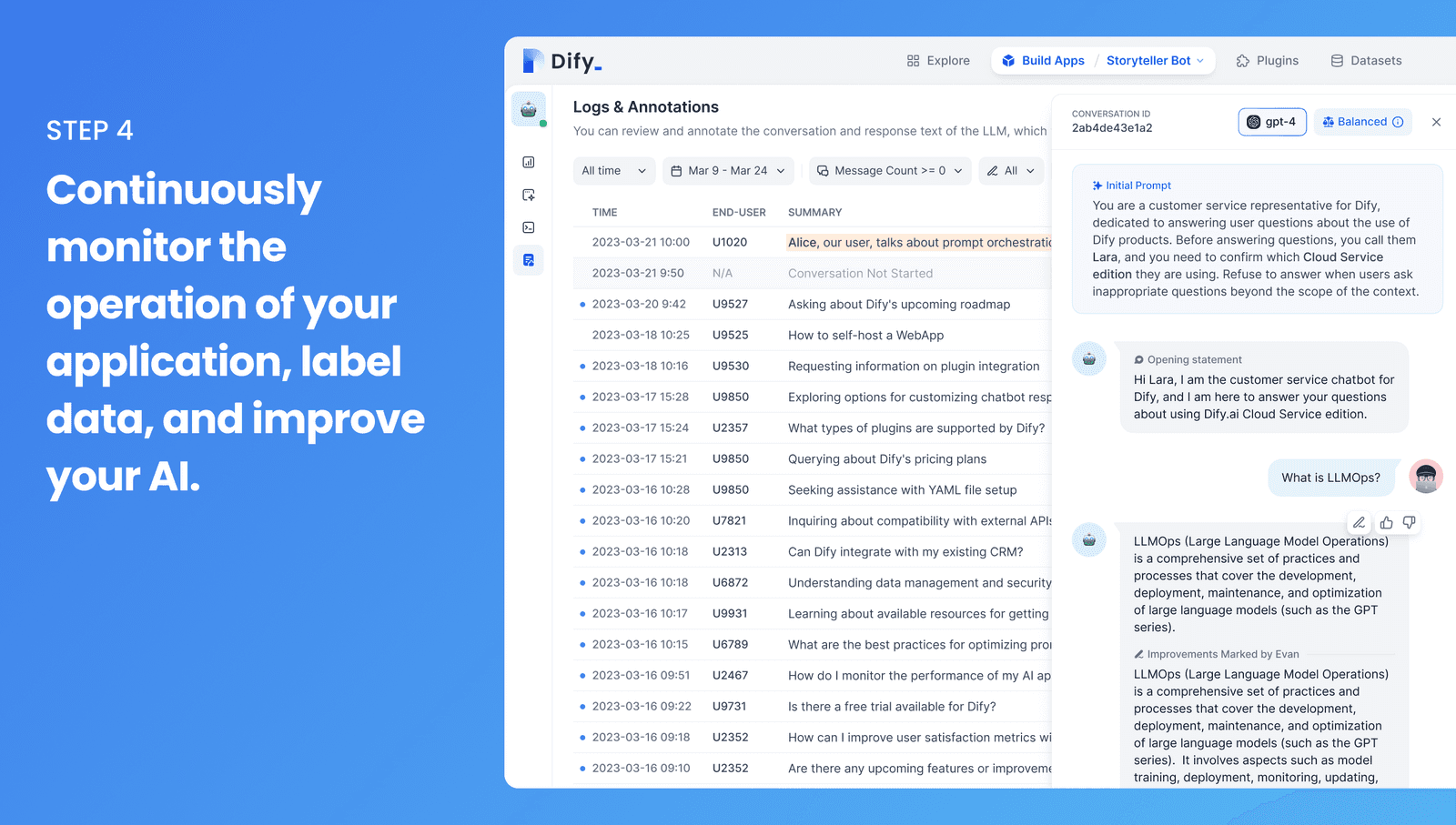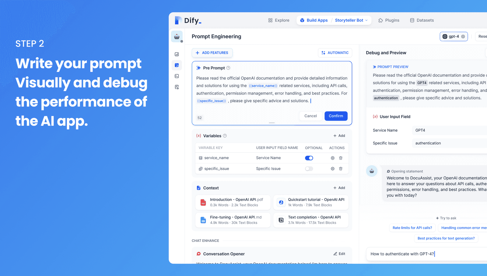 Create prompts through a visual interface and debug them in just a few minutes to publish an AI application.02. Long Context Integration (Dataset)