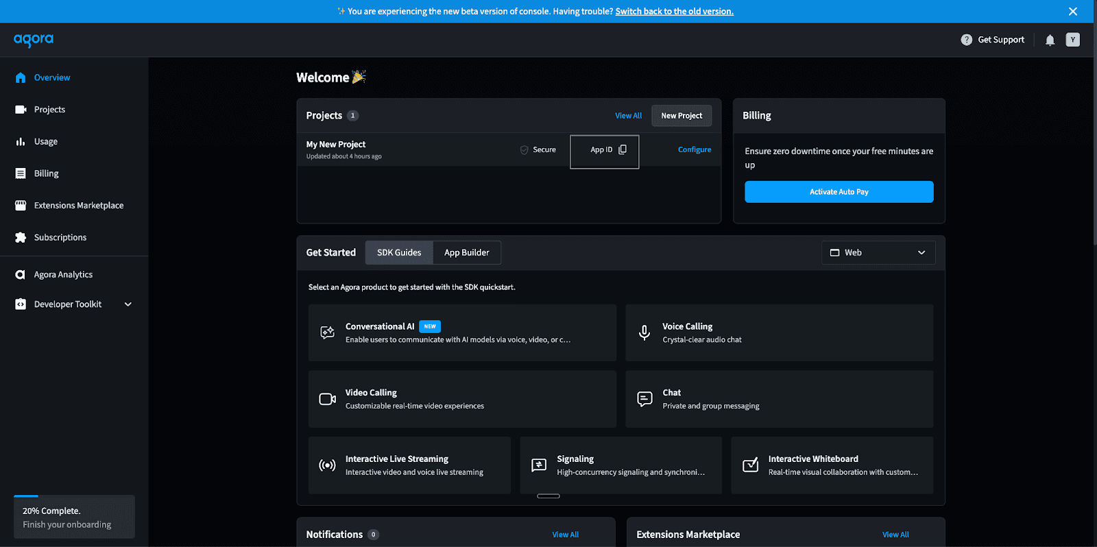 First, log into Agora’s console, then create a project and copy the App ID. Save it for later use. If you have enabled a certificate for your project, save that as well.