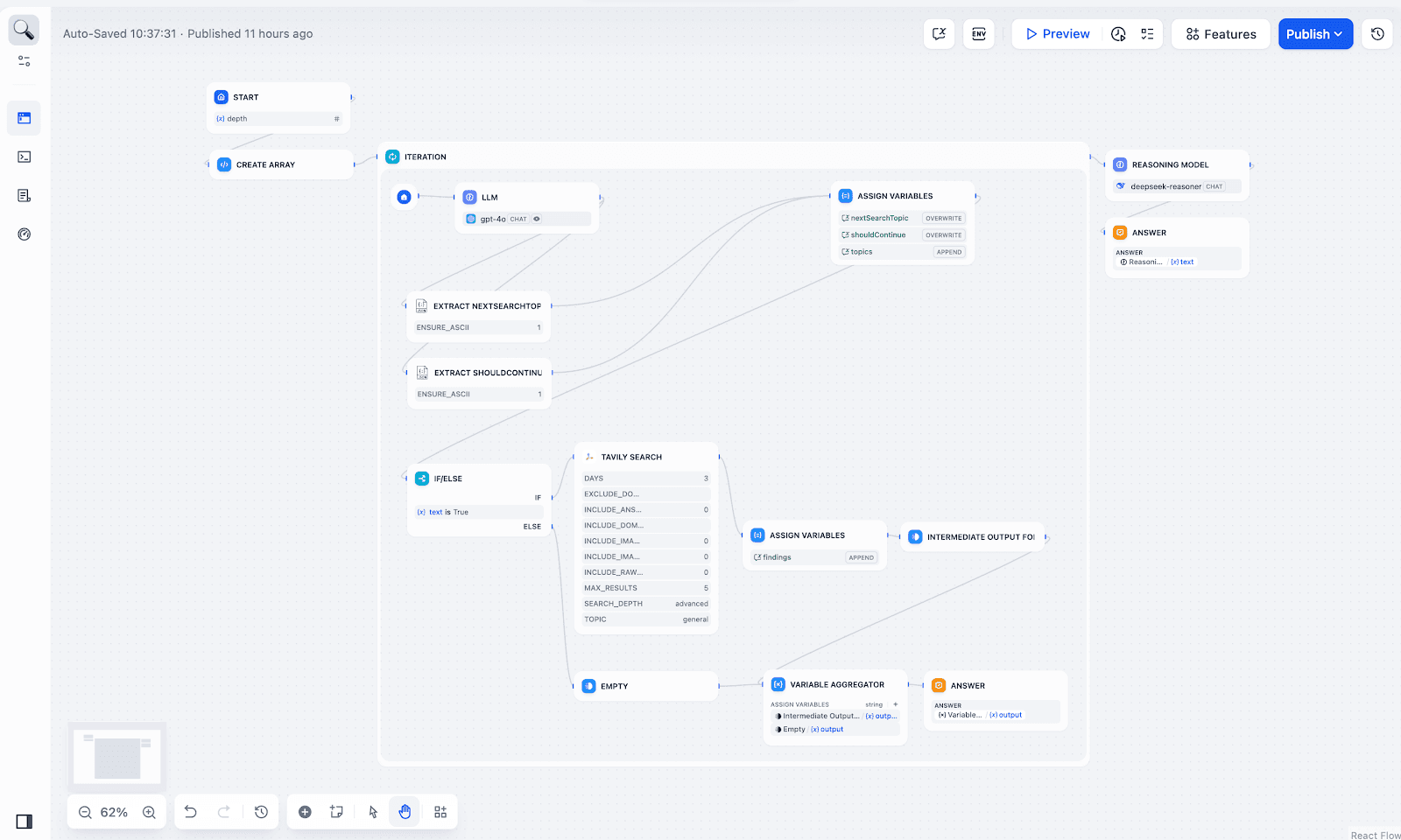 Let’s use the “Deep Research” app as an example. This app takes a user’s question, runs multiple rounds of searches using the Tavily plugin (with the number of searches set by a depth parameter), and then uses an LLM to compile the results into a research report.