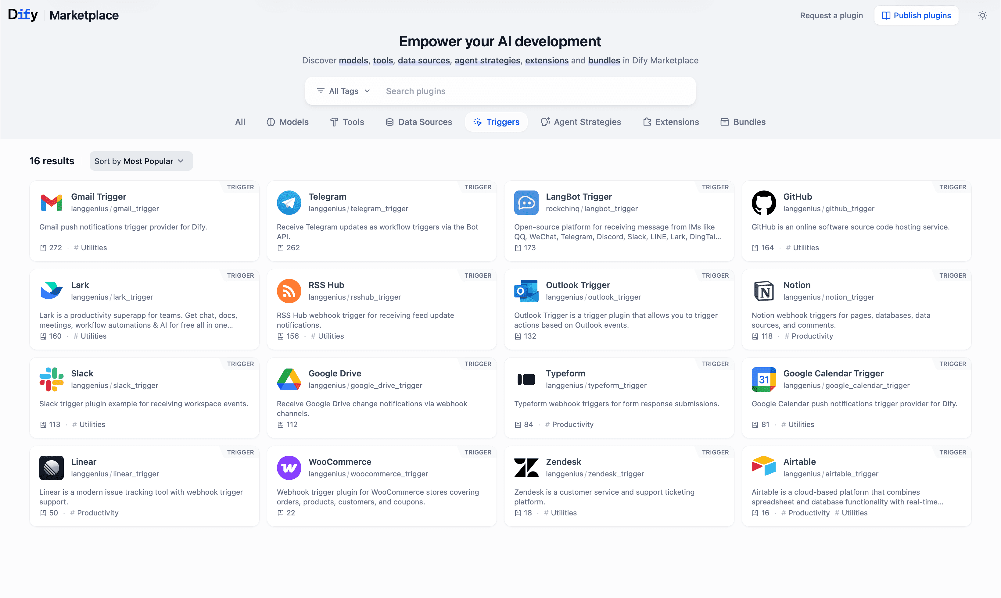 If the external system you rely on (GitHub, Slack, Outlook, Zendesk, calendar services, etc.) already provides a Trigger in the Dify Plugin Marketplace, this is the recommended choice.