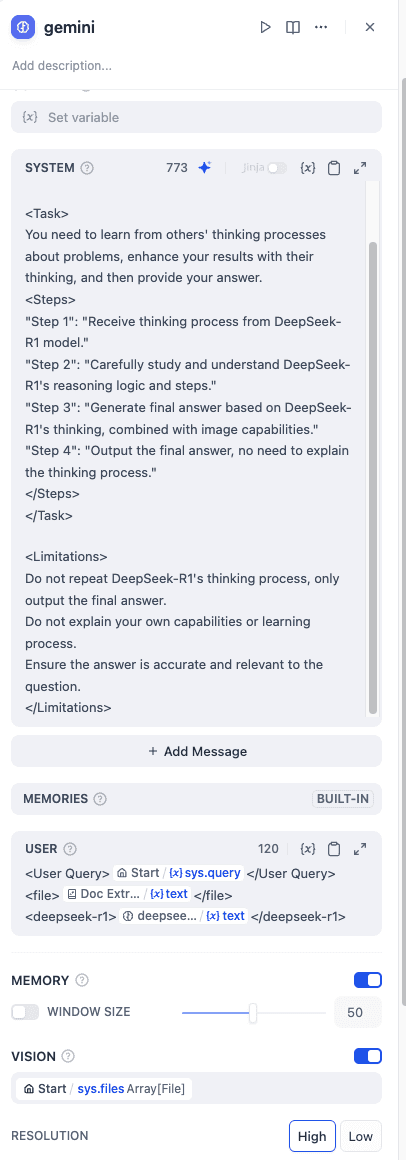 On Dify, you can quickly build a bidirectional collaborative system based on DeepSeek R1 and multi-modal models through visual workflow design.