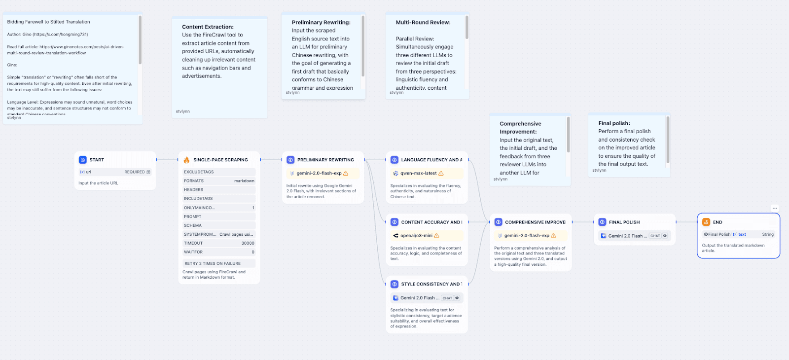 This article outlines the practical development of this workflow, covering its design, Prompt Engineering strategies, model selection, and additional steps like typesetting and publishing. The objective is to showcase how AI can boost content creation efficiency and quality, offering a solution for readers who find English technical materials difficult to access. Ultimately, this workflow supports the production and dissemination of high-quality Chinese technical blogs, encouraging learning and knowledge-sharing across a wider community.