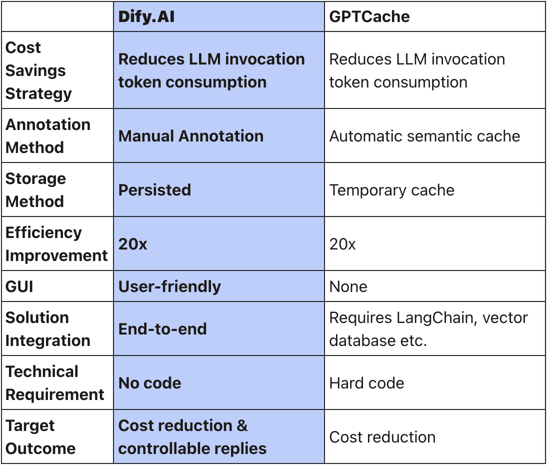 So why choose Dify.AI over GPTCache? GPTCache creates a semantic cache for LLM queries by automatically caching duplicate semantics to reduce requests and tokens sent to LLM services for cost savings. In contrast, Dify persists custom annotated responses to reduce LLM requests, achieving the same cost savings while storing production-quality data more reliably for retrieval.