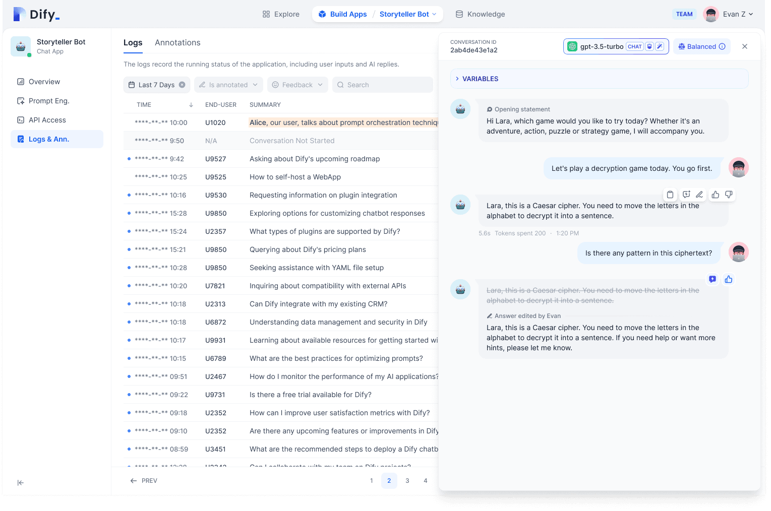 During application operation, Dify also facilitates collaboration between developers and business managers without hard coding changes. Business manager are the best one who understand customer needs and know the optimal answers! After developers build the application, business teams can take over data improvement by editing replies or importing existing Q&A data.