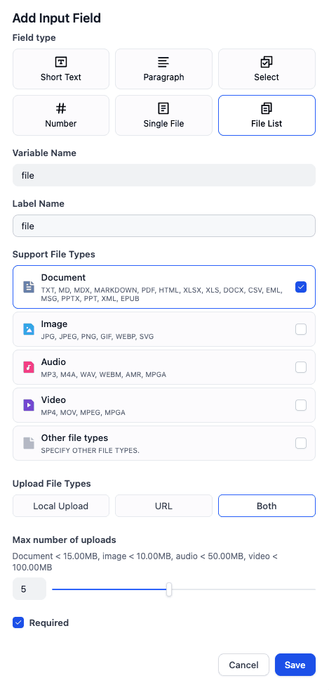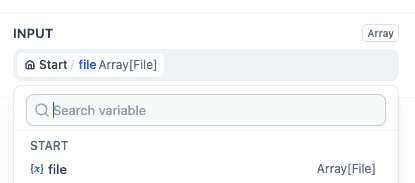 In the start node, click + to add a variable of the File type. Select the file type as File List, set the file type to Document, and name the variable "file".