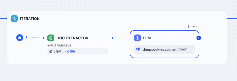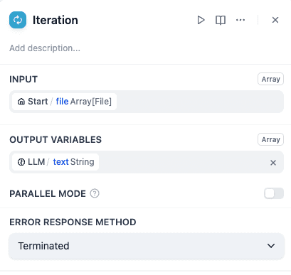 First, add the Iteration node after the Start node. You will find that the Iteration node is like a smaller workflow, in which there are also start variables and output variables. Here, you need to set the Iteration node's input variable to file.