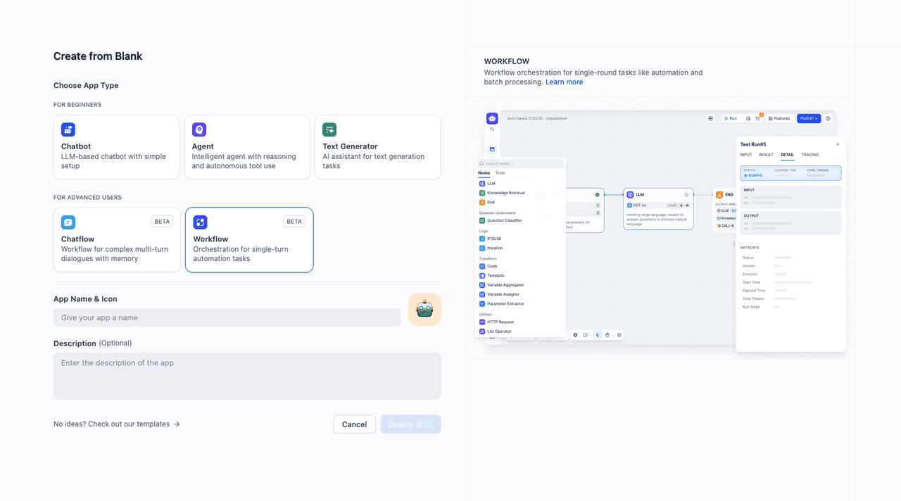 You need to choose the appropriate application type according to the application scenario you are building. In this demonstration, we will choose the Workflow type.