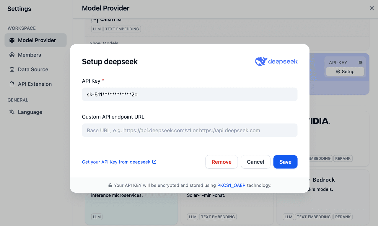 Visit the Dify platform, click on your avatar in the upper right corner -> Settings -> Model Provider, find DeepSeek, and paste the API Key you obtained earlier.