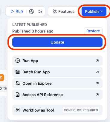 If you want to further develop the application's front-end interface, you can refer to Dify's API documentation. Click "Access API" on the right to view the API documentation and manage the application's API Key.