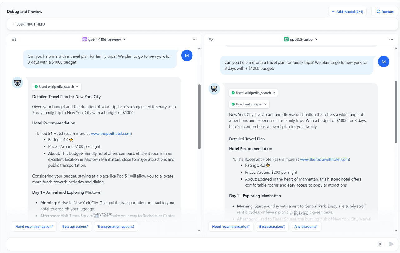 Simply click on the model, then click on [Multiple Models for Debugging] to enter the debugging interface. Here, a simple comparison of a single output from GPT-4 and GPT-3.5 clearly shows that the answer generated by GPT-4 is different from that of GPT-3.5 in terms of writing style, length, and output quality.