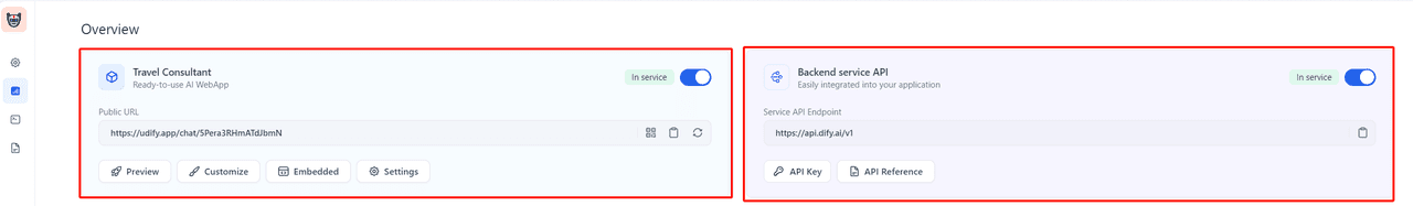 After completing the above steps, how do we integrate this travel planning assistant into the existing workflow? Select "Overview" in the left sidebar, where we offer two methods: