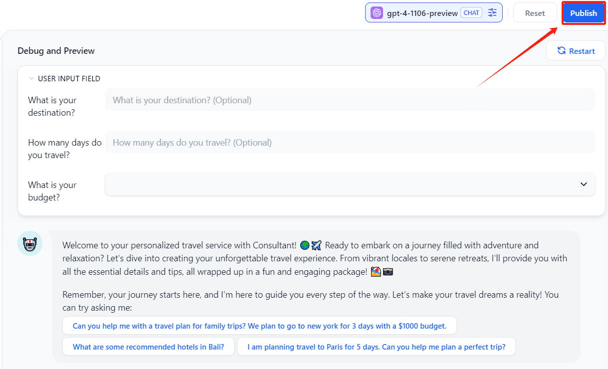 After writing the prompt, remember to click "Publish" to save all changes. Once published, your Agent can be put into use at any time.