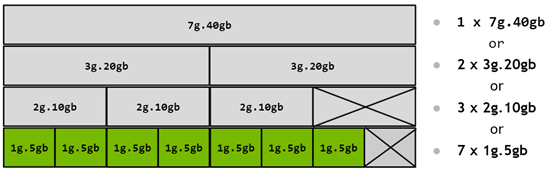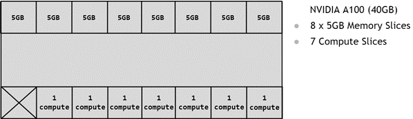 Partitioning of the GPU happens using memory slices, so the A100-40GB GPU can be thought of having 8x5GB memory slices and 7 SM slices as shown in the diagram below.