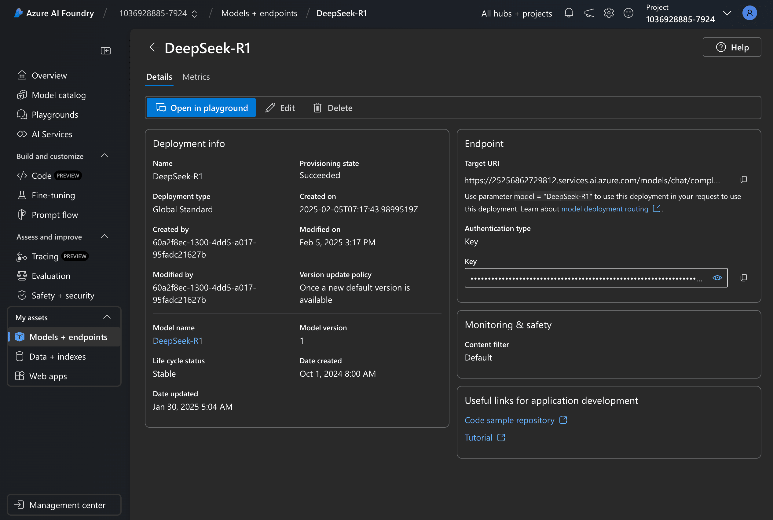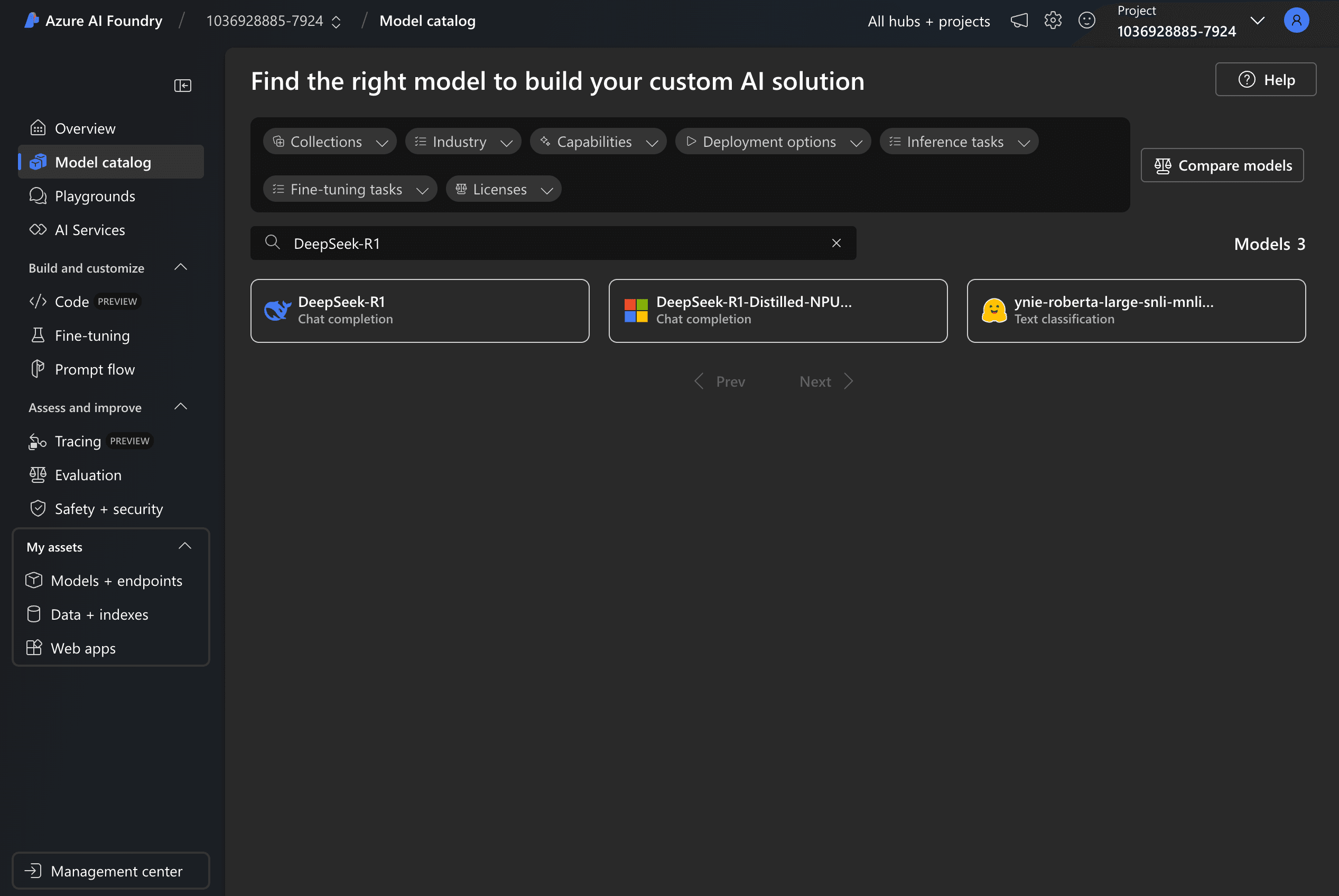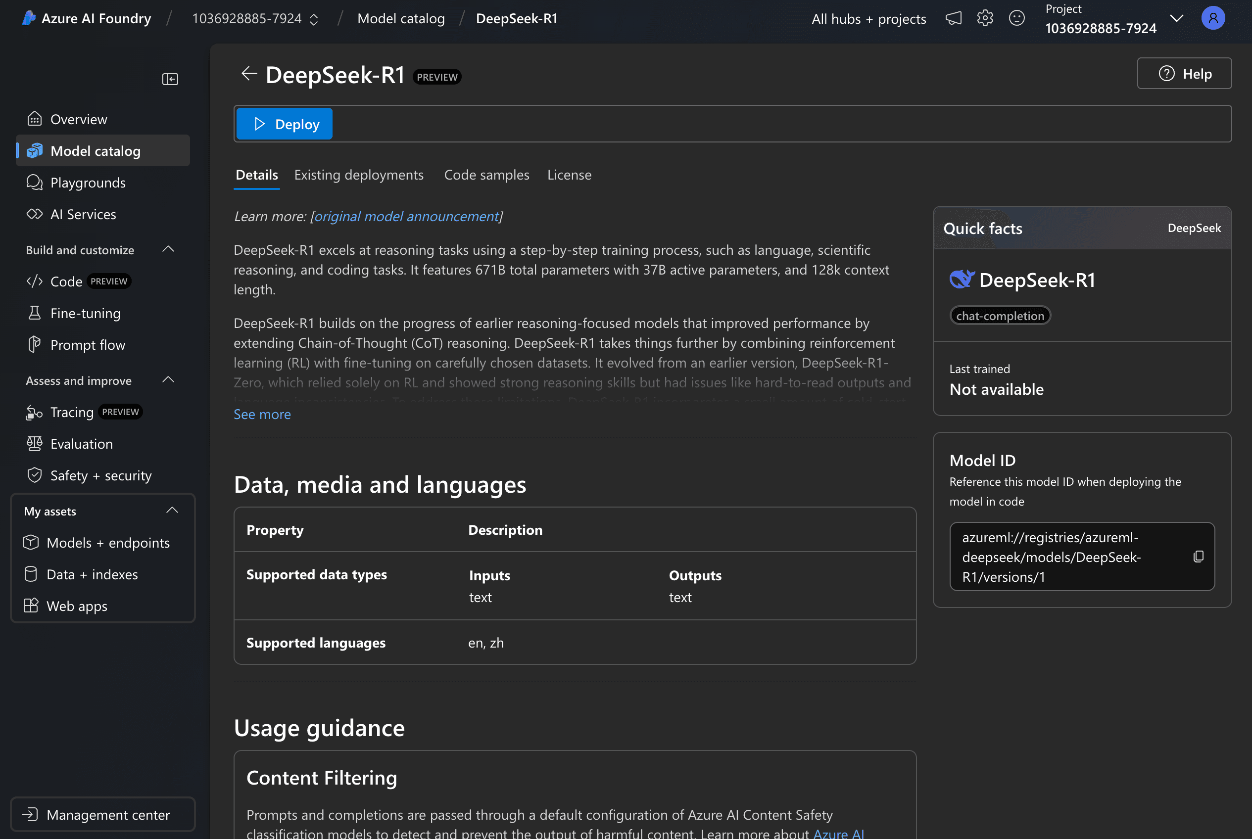 Search for "DeepSeek-R1" in the Model Catalog and "Deploy" it.