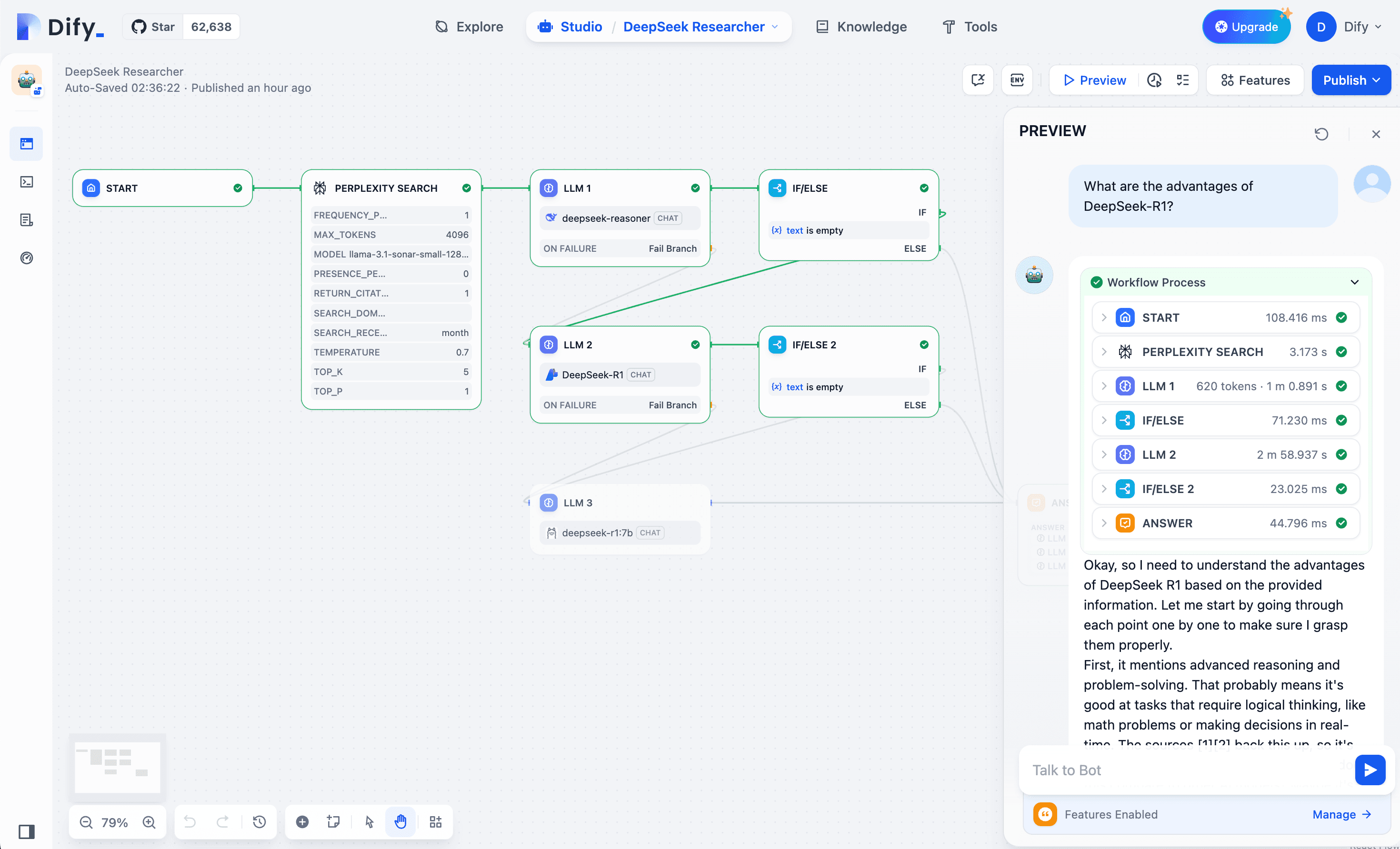 The example below uses Perplexity + DeepSeek API + backup R1 (Azure/Ollama) for an AI research assistant. If LLM 1 (official API) times out, it switches to LLM 2 (Azure R1), generating the report and maintaining uptime.