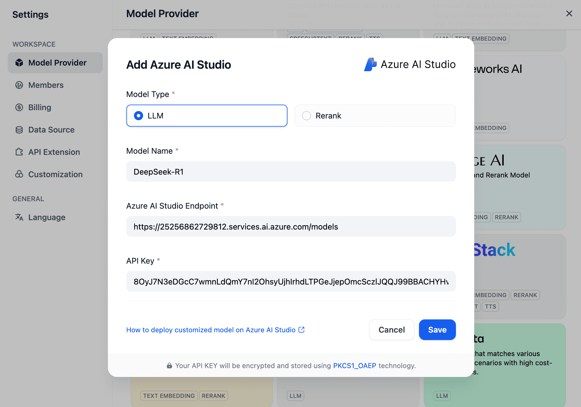 Find the Model Name, Endpoint, and API Key in "My assets." Enter these in Dify's "Model Providers" (Azure AI Studio Endpoint).