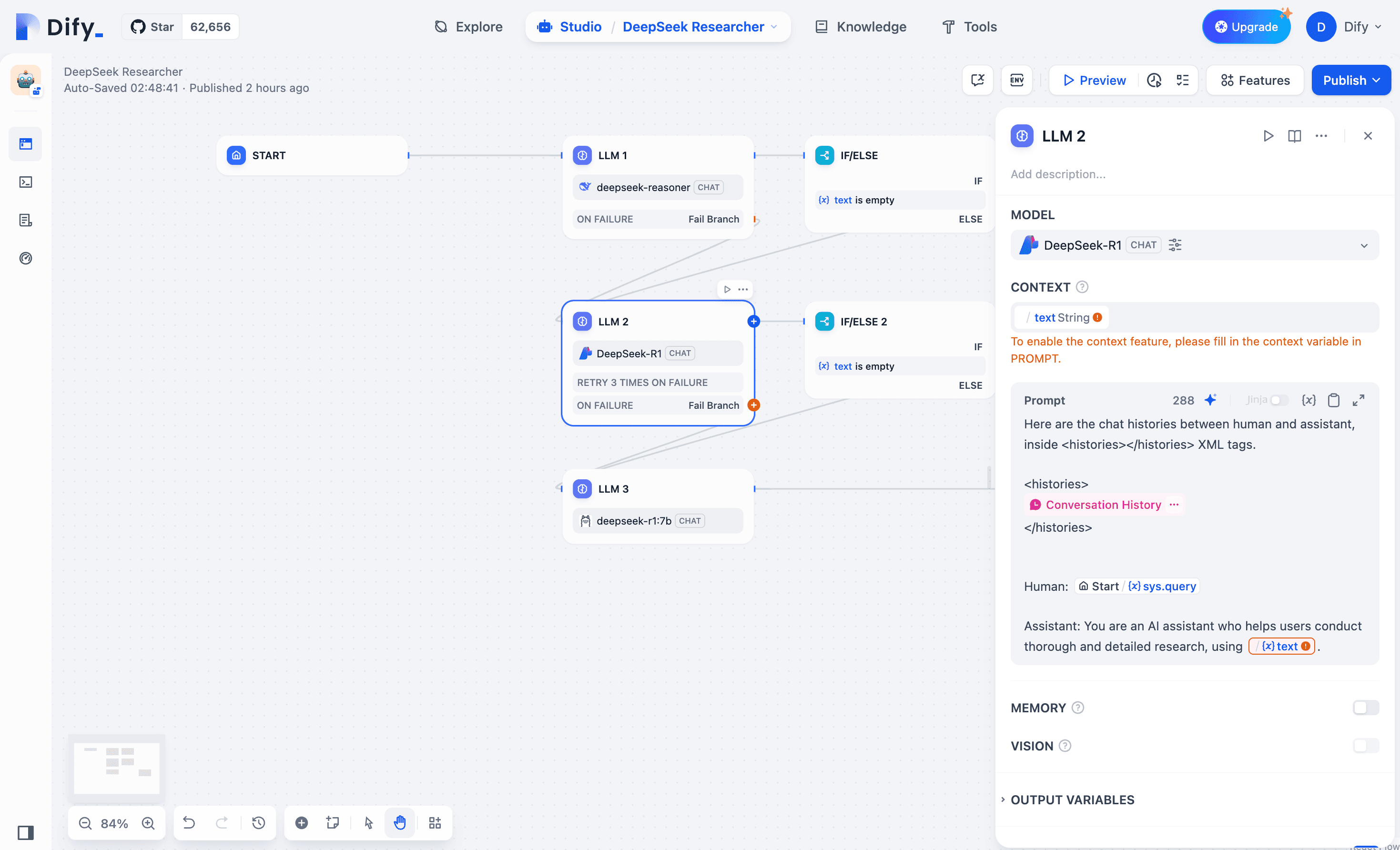 Load Balancing & Failover: Use Dify's "Error Handling" and conditional nodes to set up the official API and MaaS R1 versions as primary/backup. If the API fails or times out, the system switches to a MaaS R1, ensuring uptime.