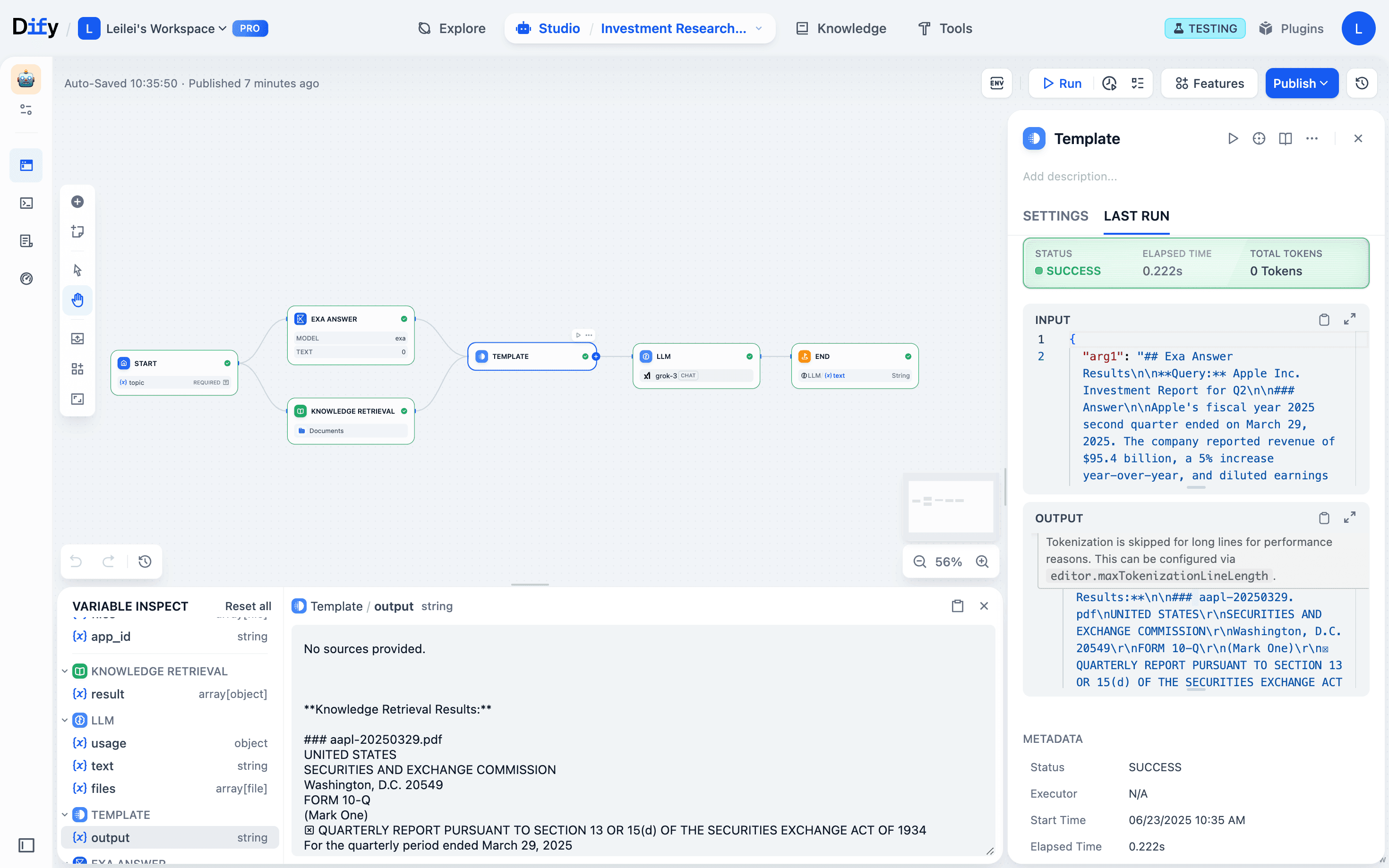 Spot issues: The variable inspect panel shows you immediately that Exa web search worked fine, but the template node output is missing knowledge base content.