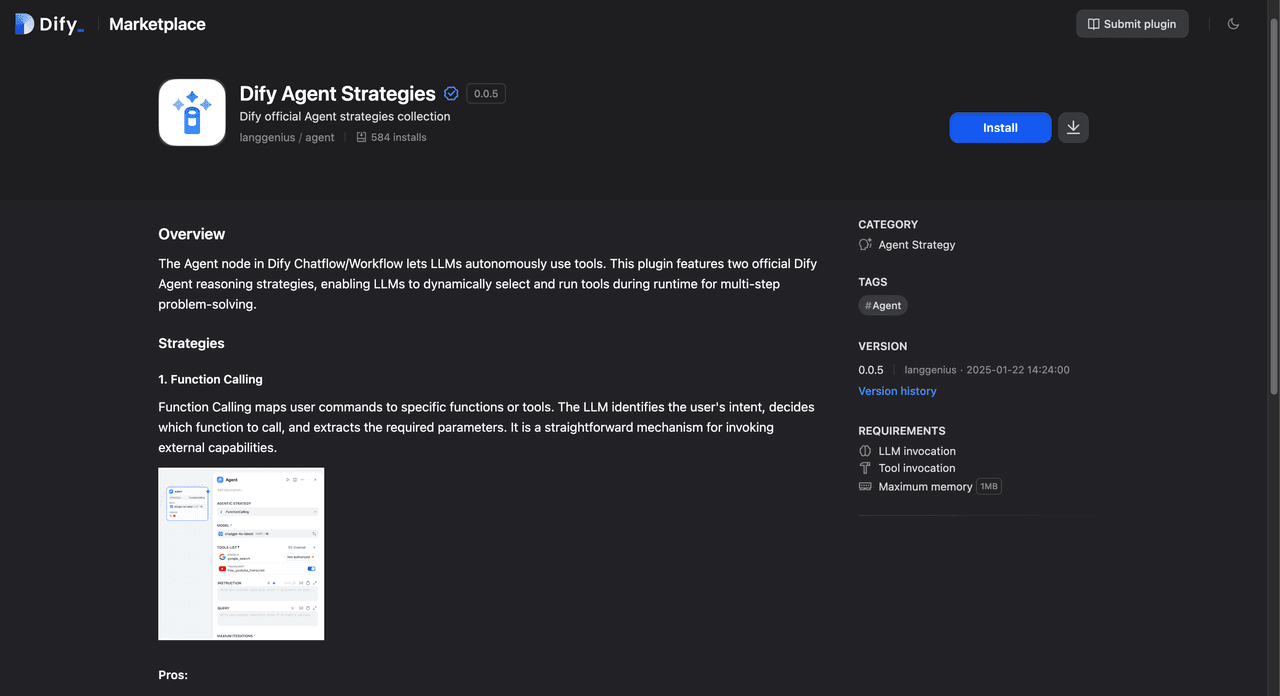 You can download both strategies directly from the Marketplace. More importantly, we’ve released an open standard for strategy development. In Dify, any developer can: