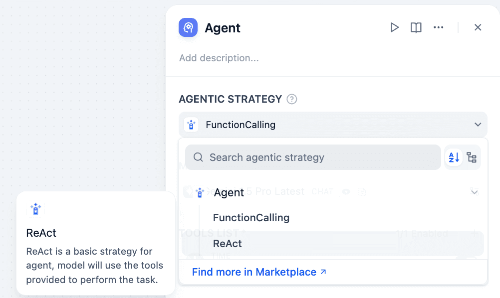 Within a Workflow, the Agent Node enables autonomous thinking for multi-step tool reasoning. A minimal Agent Strategy must at least define how to use the LLM API and how to call tools.