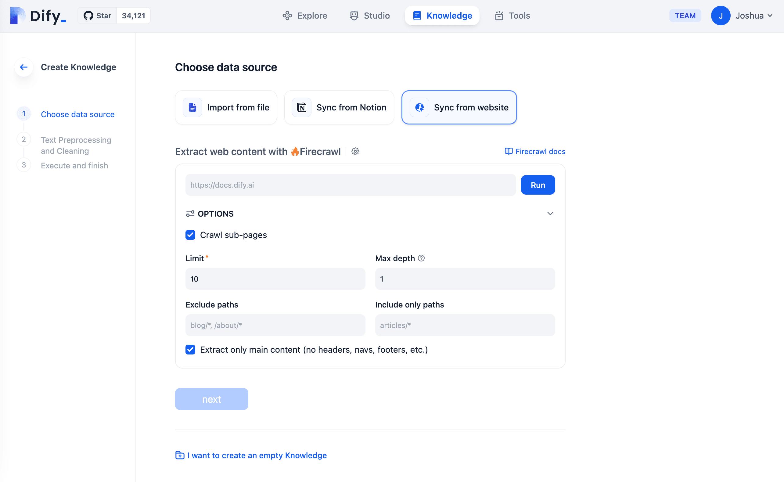 Firecrawl crawls all accessible subpages, even without a sitemap, and returns a clean, structured markdown. In Dify, we provide some options for you to easily set according to your specific needs.