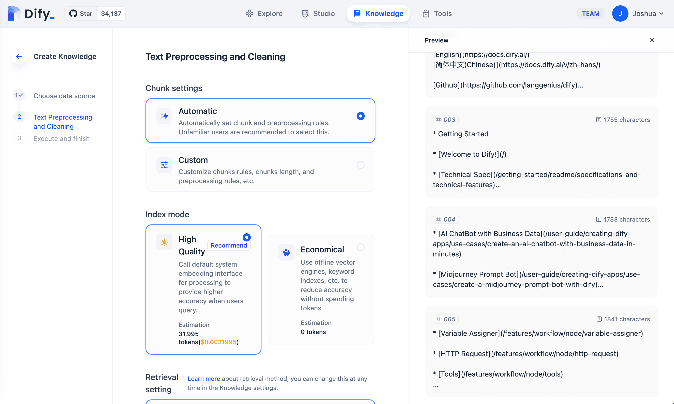 Firecrawl efficiently crawls web pages in parallel, delivering results quickly. Once the crawling process is complete, you can easily select the desired pages of web data directly on Dify. The selected web data is then ready for further text preprocessing and cleaning steps. After these steps are completed, the data will be embedded and stored in Dify's vector DB as a new knowledge base.