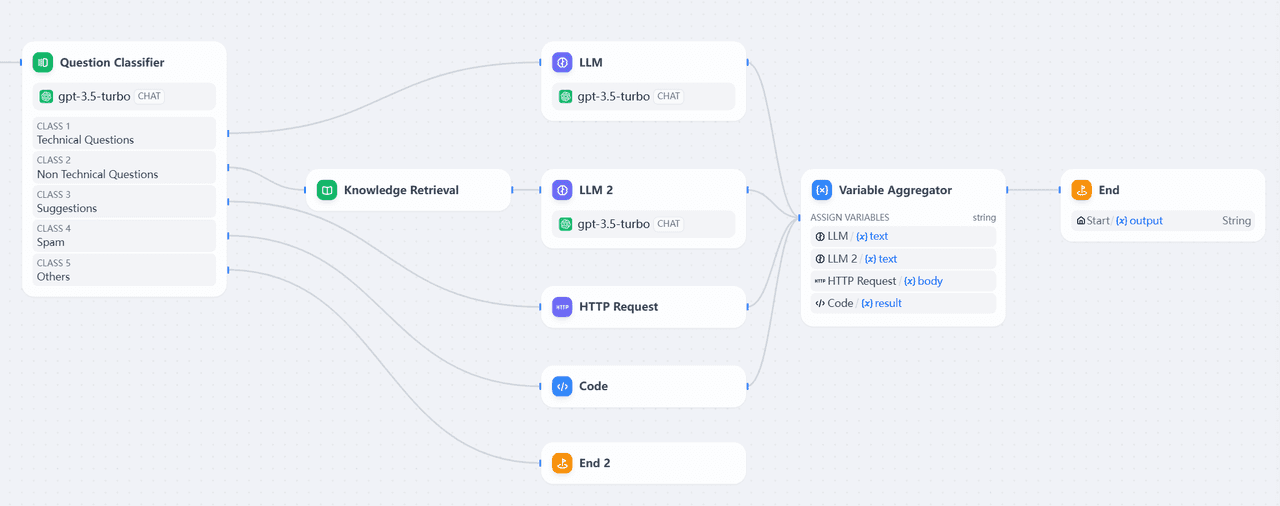 Variable Aggregator: Aggregate different branches after classification. For different issues, we can categorize emails into corresponding intelligent assistants. For customer service, we can classify issues into categories such as technical issues, non-technical issues, and suggestions. Intelligent assistants can then respond more effectively. For example, technical issues may require using RAG to query technical documents for user reference, non-technical issues may need human intervention, and suggestions can be forwarded to various department databases to collect corresponding requirements.