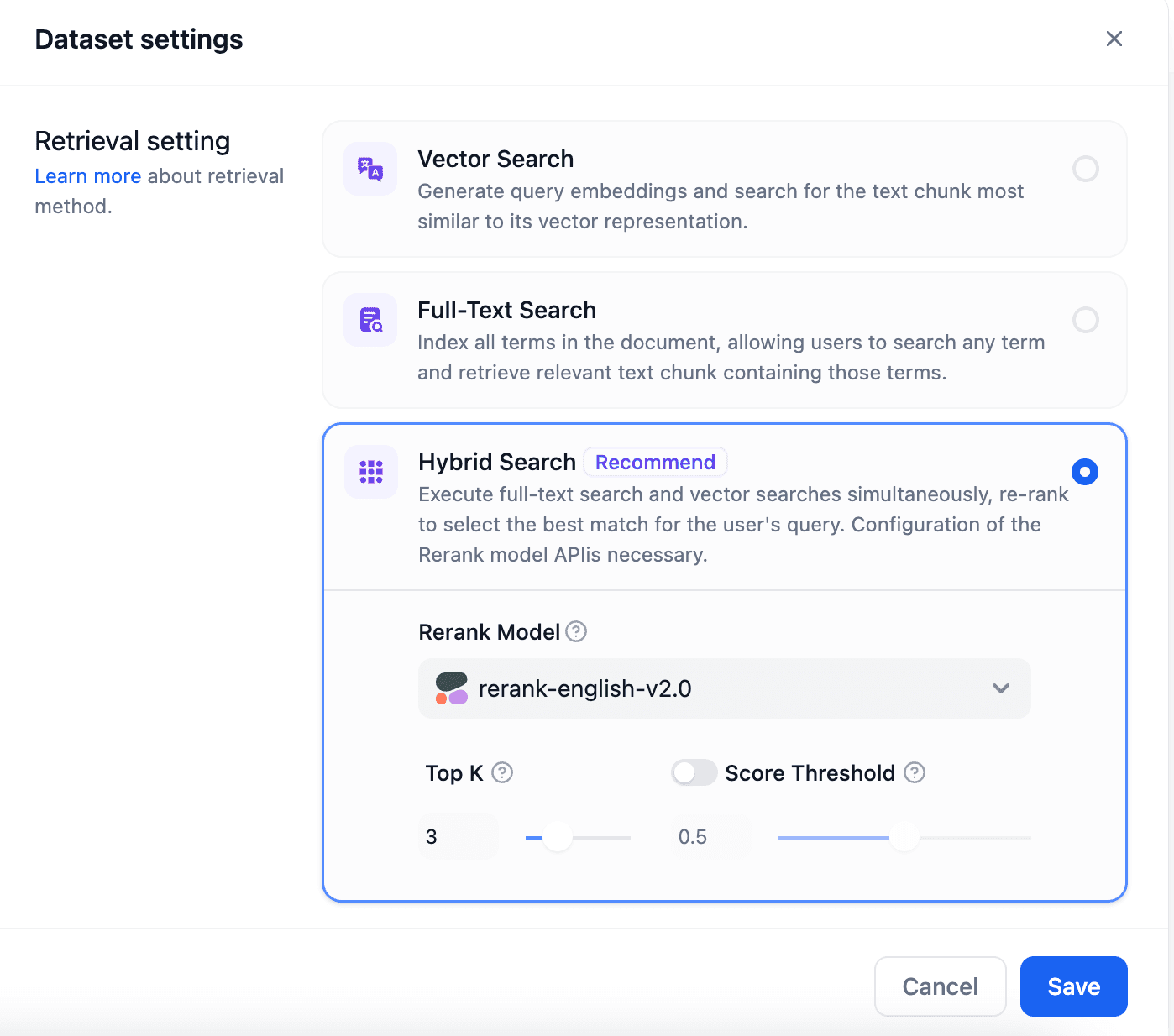 Hybrid Search: We've broadened dataset upload capabilities with multiple search options: vector search, full-text search, and a novel hybrid search that melds the strengths of both methods.