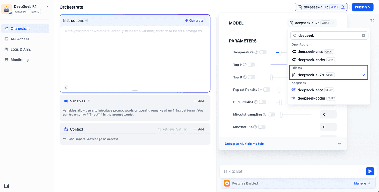 Choose the deepseek-r1:7b model from the Ollama framework in the top-right application type selector.