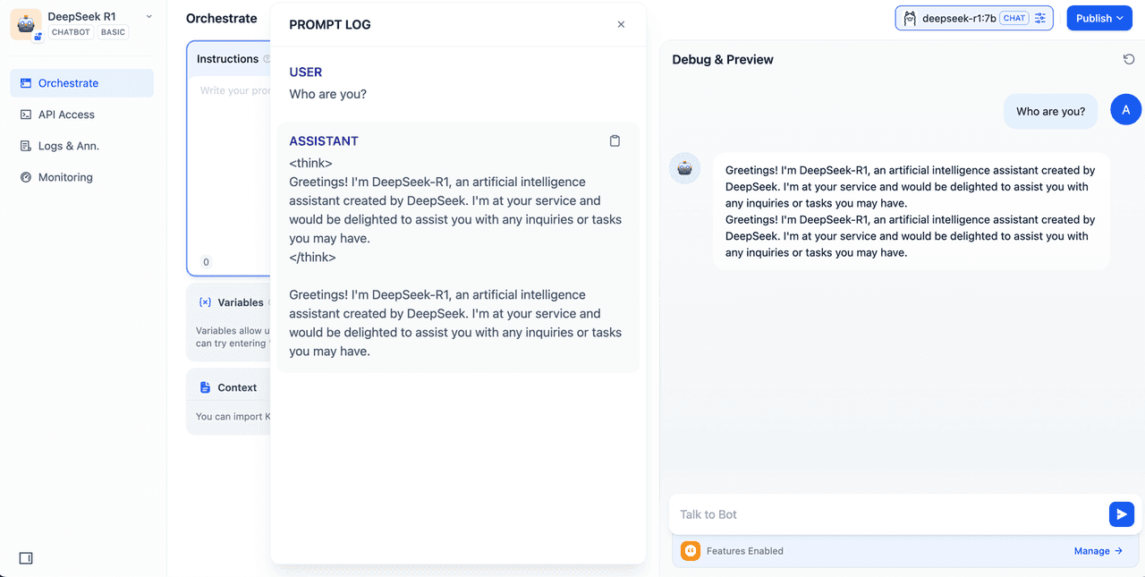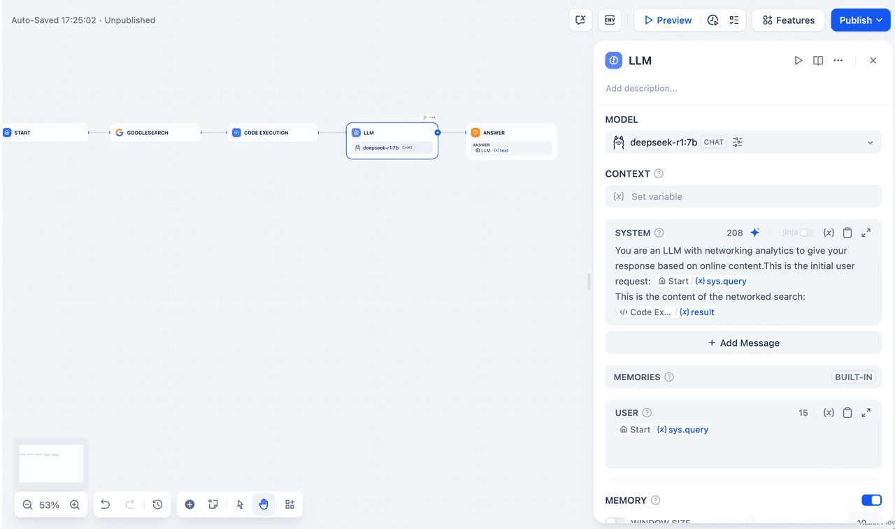 5. Finally, add an End node that references the output from the LLM node. Test your setup in the preview window; if you get a response, your app is ready, and you can inspect the LLM’s reasoning process in the logs.