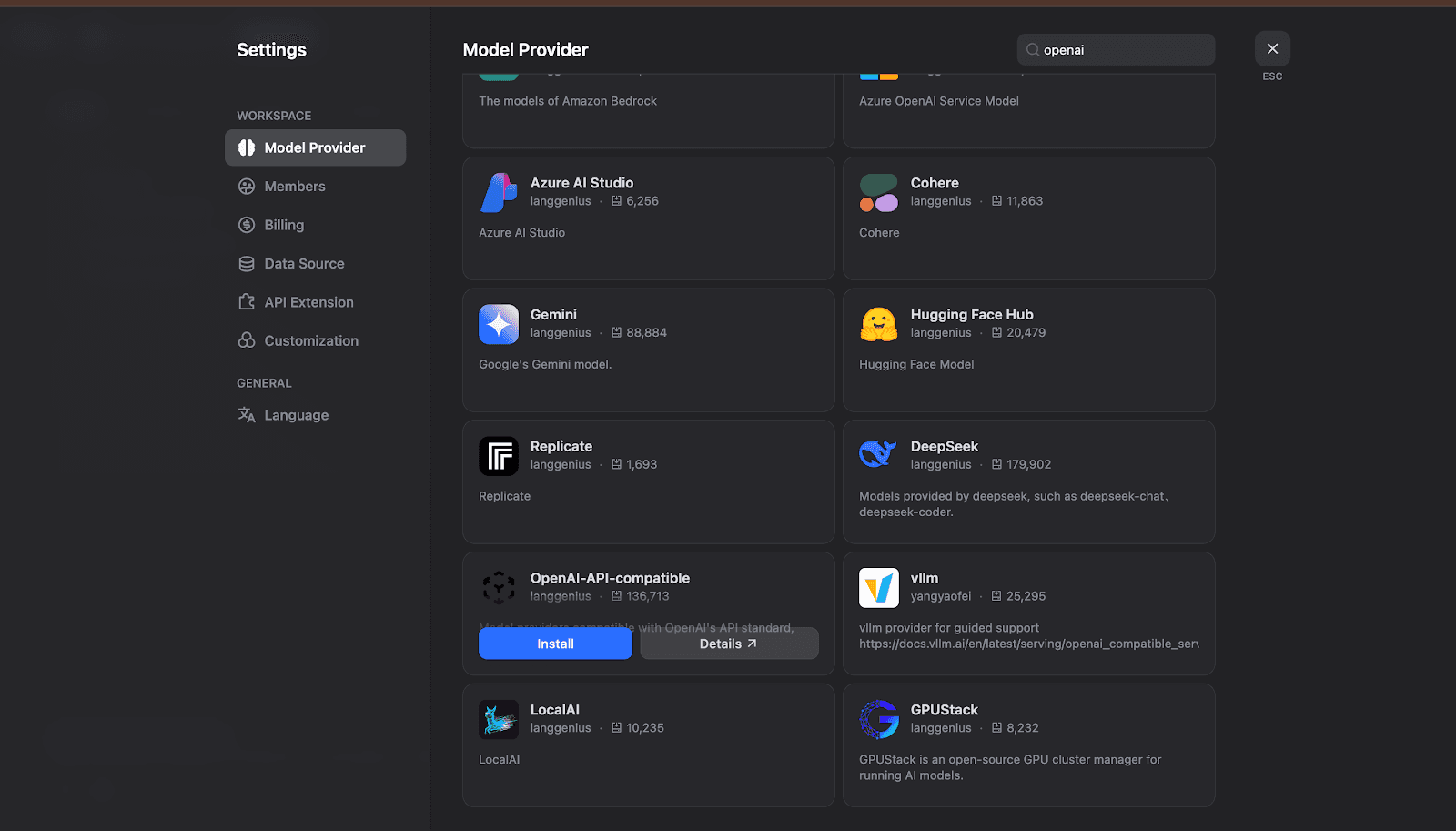 In the Model Provider section, search for OpenAI-API-compatible and click on Install.