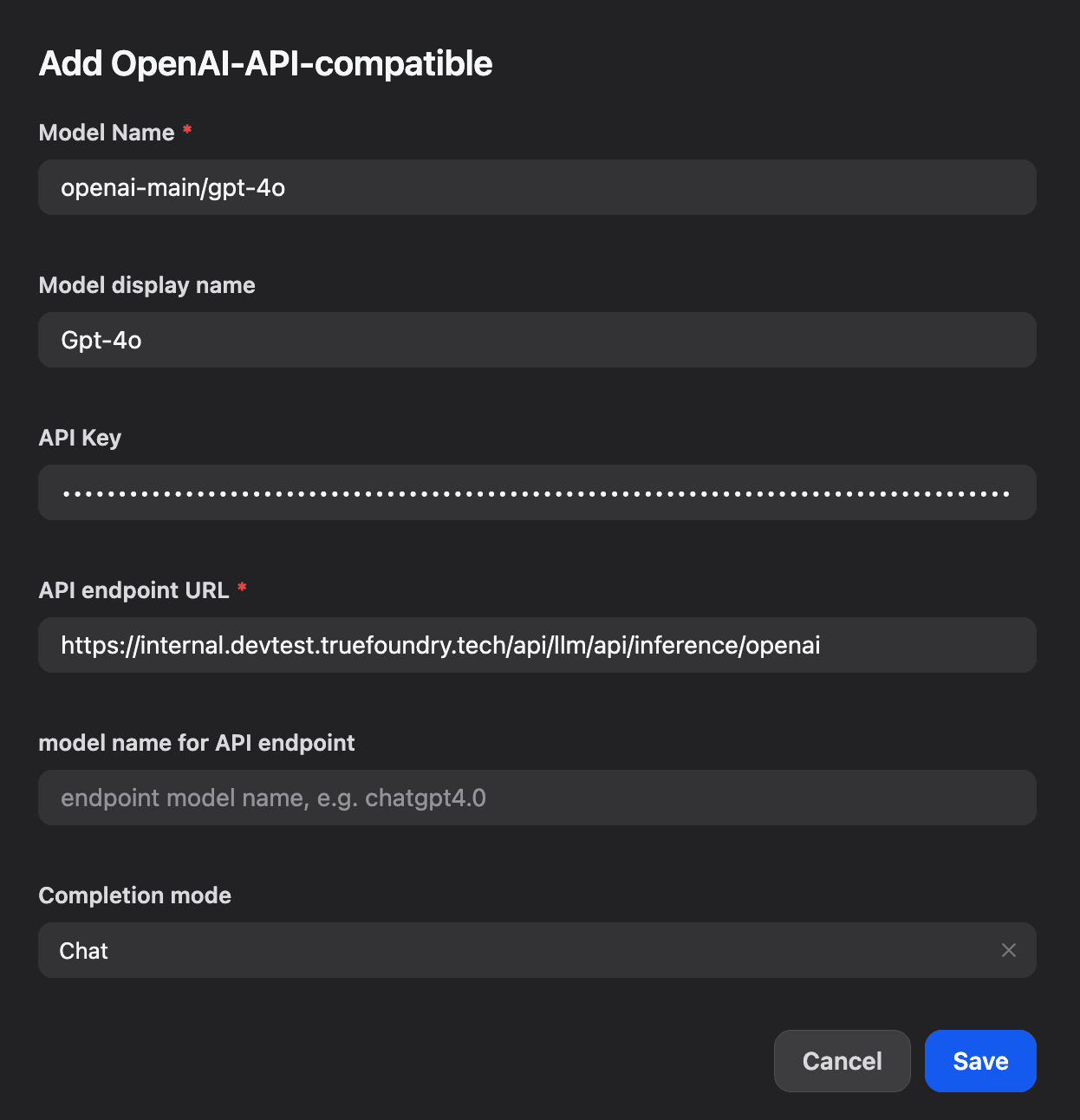 Model Name: Your TrueFoundry model ID (e.g., openai-main/gpt-4o)