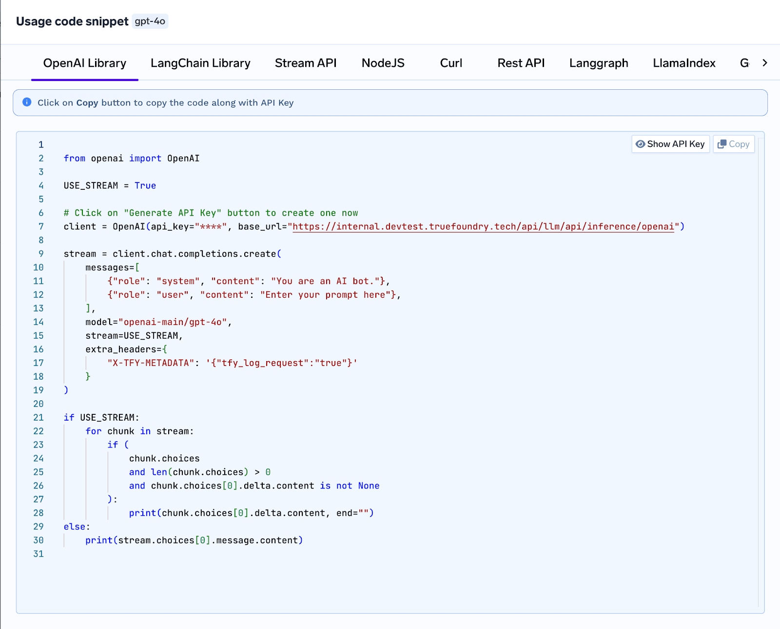 You'll also need to get the API endpoint URL from the unified code snippet provided by TrueFoundry.