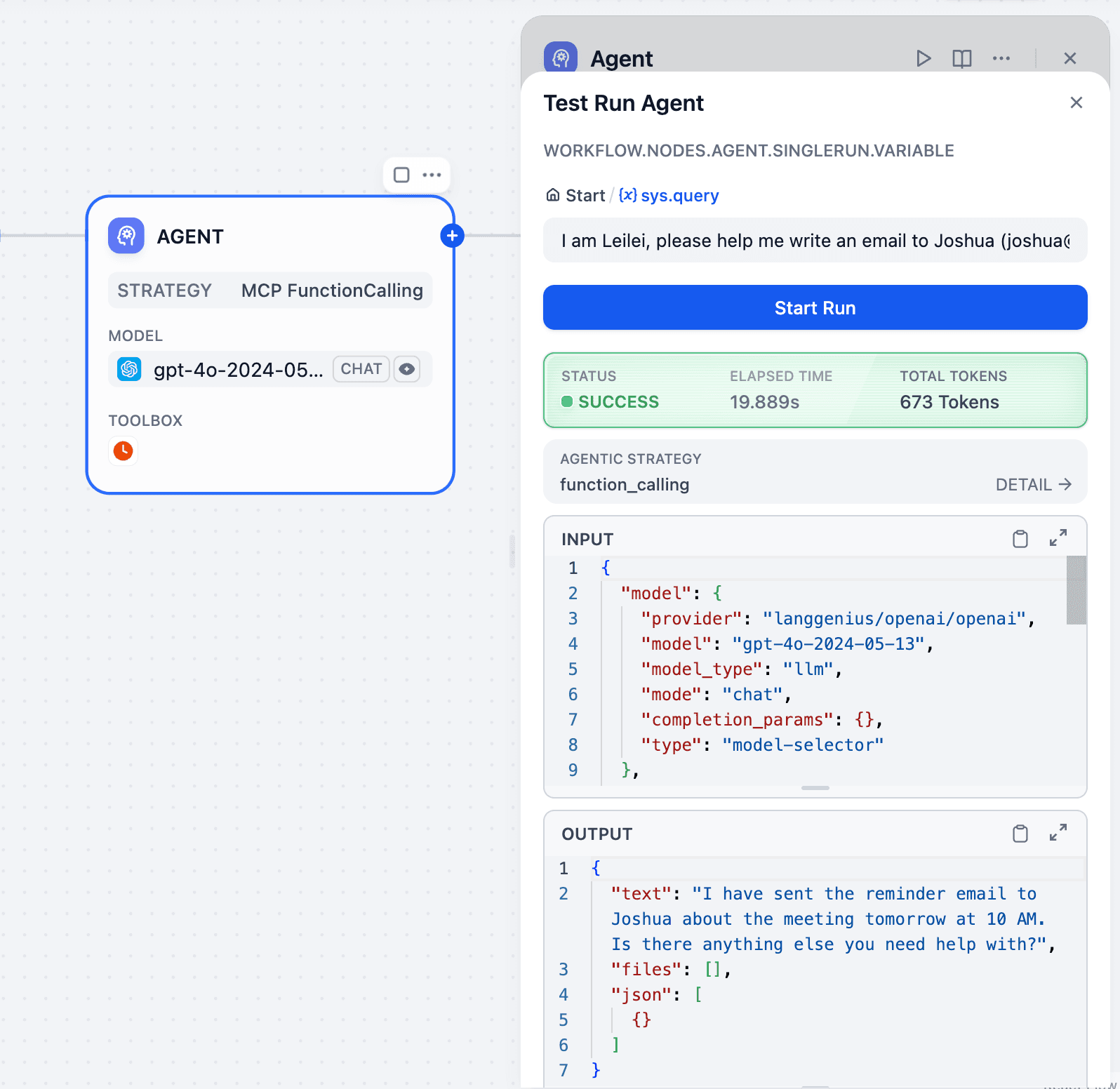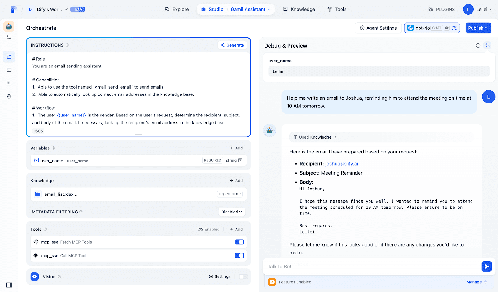 Additionally, you can upload a contacts Excel file to Dify's knowledge base. This allows the Agent to auto-match recipient emails when you provide just the name and message content. Also, you can set specific prompts to ensure emails are confirmed by users before sending, as shown below: