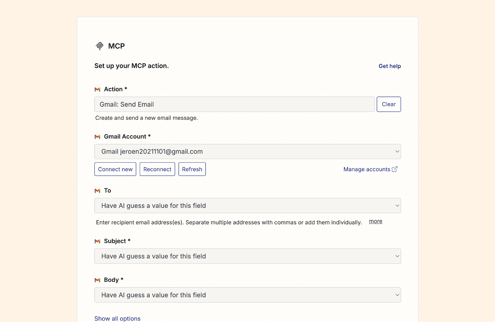 For fields like recipient, subject, and body, select "Have AI guess a value," allowing dynamic AI-driven content generation based on your Agent's interactions.