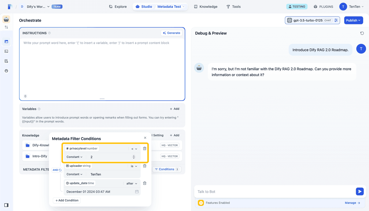 Hi, I'm Yawen from the Dify product team. Today, we're excited to launch Dify v1.1.0 with the new features of Metadata as a Knowledge Filter. Metadata filtering enhances the retrieval and accuracy of relevant data in knowledge bases by leveraging custom metadata attributes. Previously, users had to search through an entire vast dataset without the ability to filter or control access based on specific needs, making it difficult to narrow results to the most relevant information. With metadata, data is essentially tagged and categorized, significantly improving retrieval efficiency and accuracy. This concept is particularly significant in the context of RAG(retrieval-augmented generation) , where vast amounts of information need to be efficiently managed and accessed.