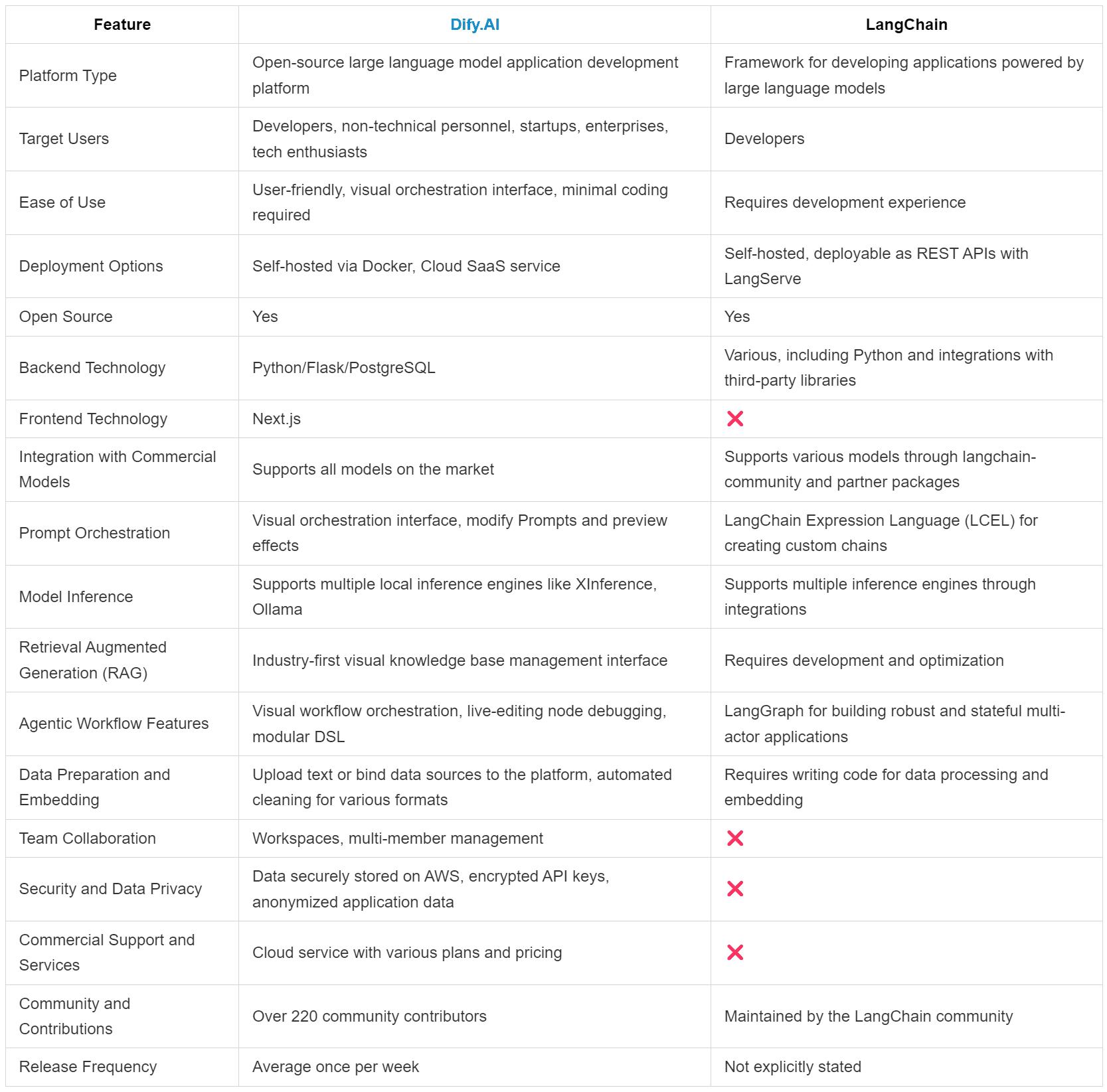 Unlike LangChain, where much of the code is contributed by third parties who may not be accountable for its quality or maintenance, Dify's features deliver what's promised. We hold ourselves to high standards of quality and reliability, and we apply those same standards to contributor PRs.