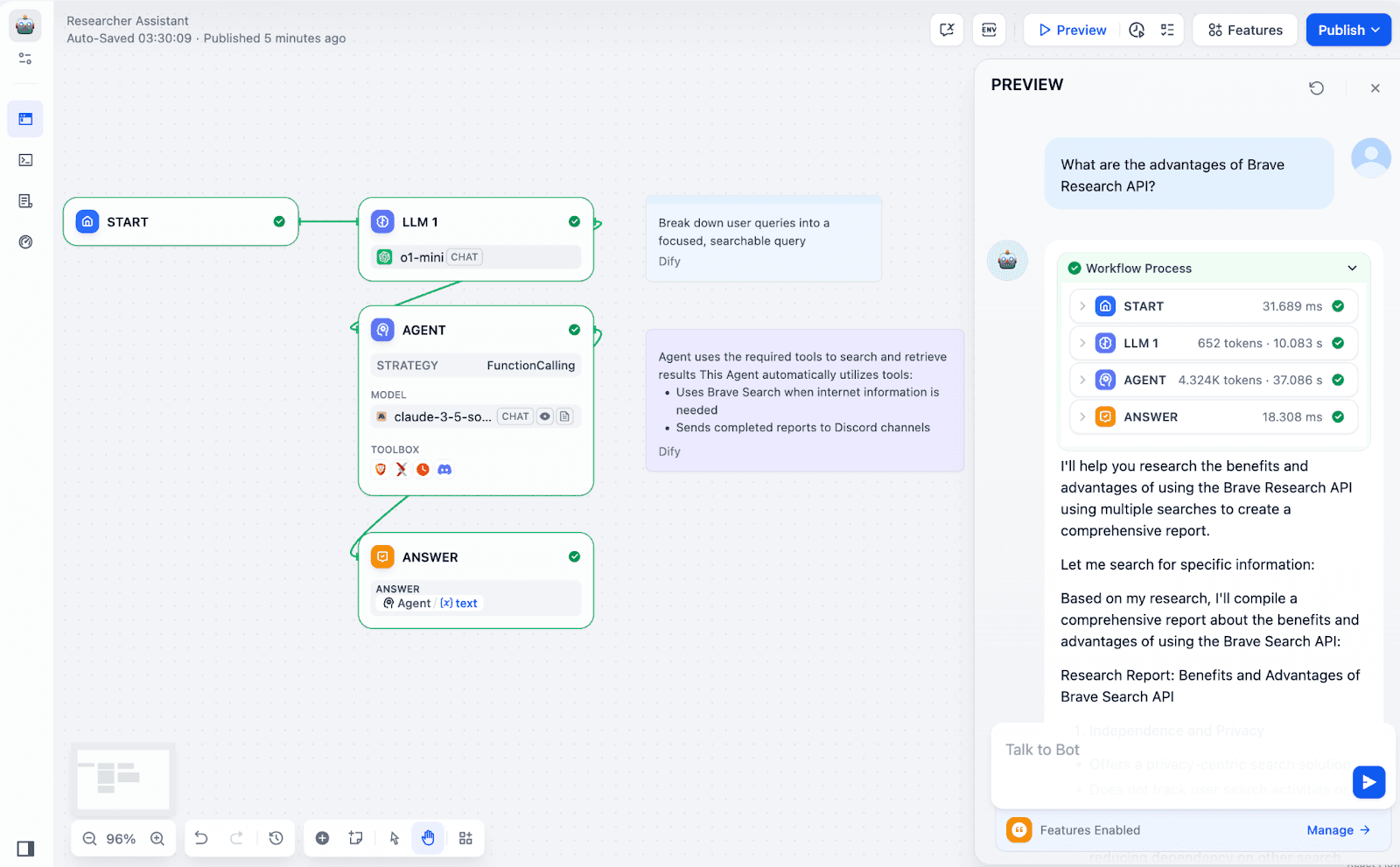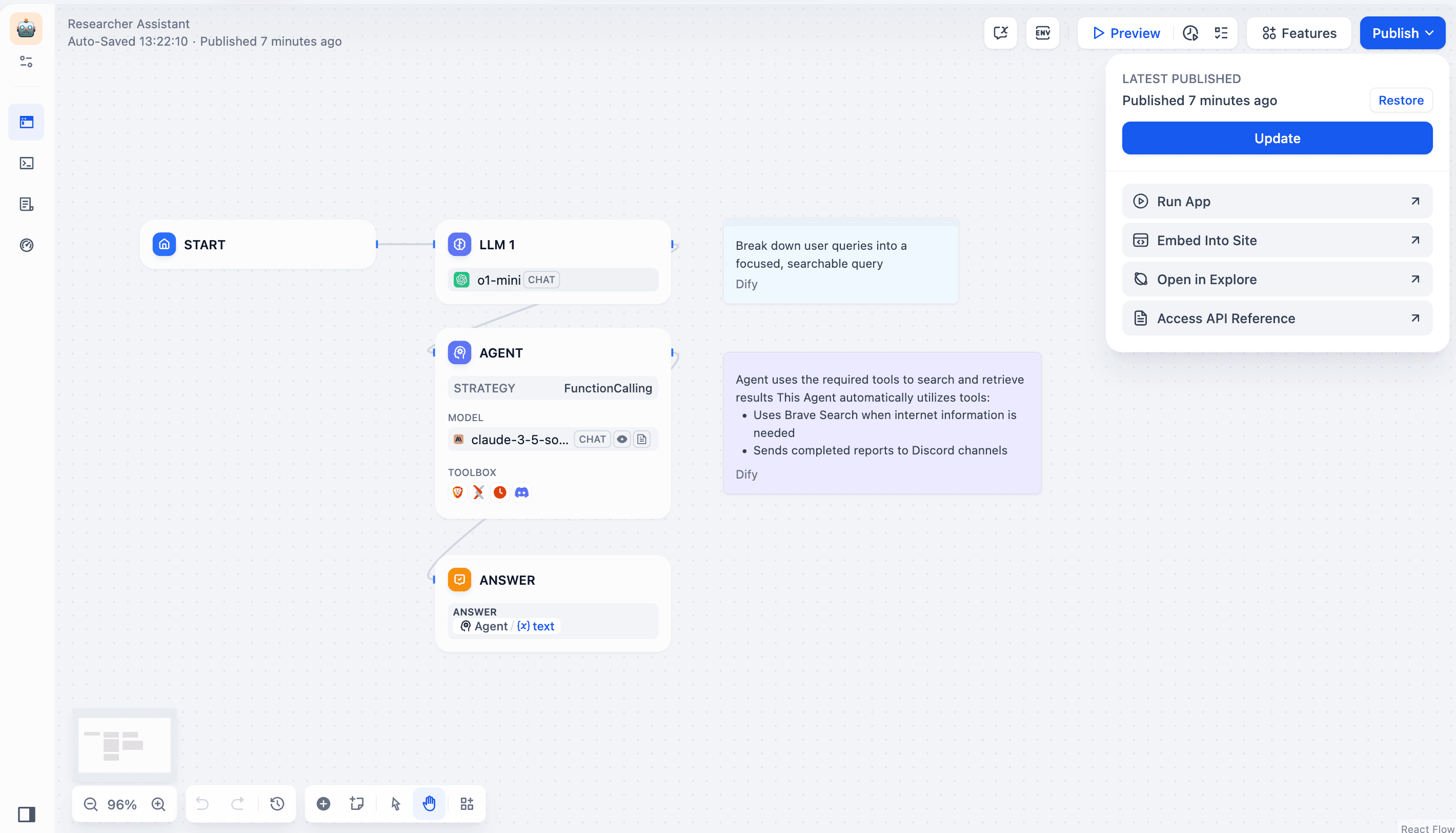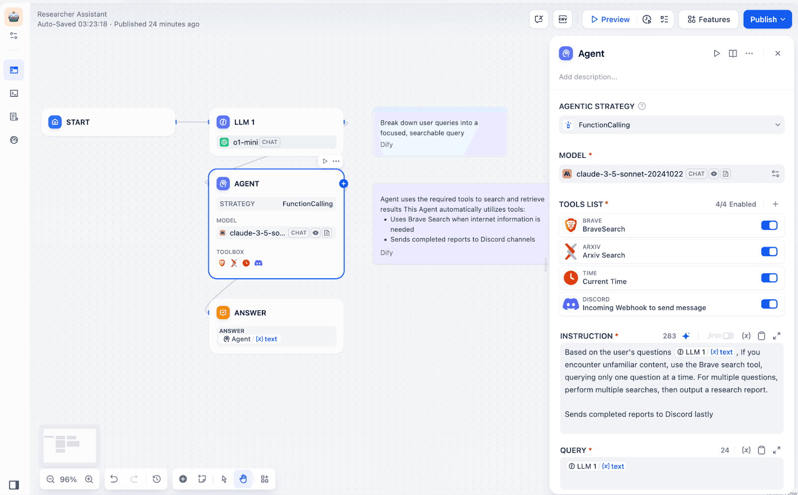 For more sophisticated AI applications, Dify Workflows provide a structured and modular framework. Let's create a research assistant workflow as a practical example: