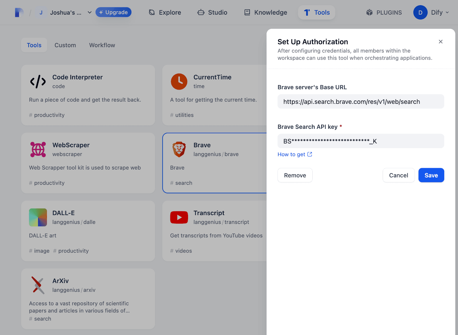 Locate the Brave Search API plugin within the Dify Marketplace, found under "Search Tools." Install and authorize the plugin to add search capabilities to your AI applications.
