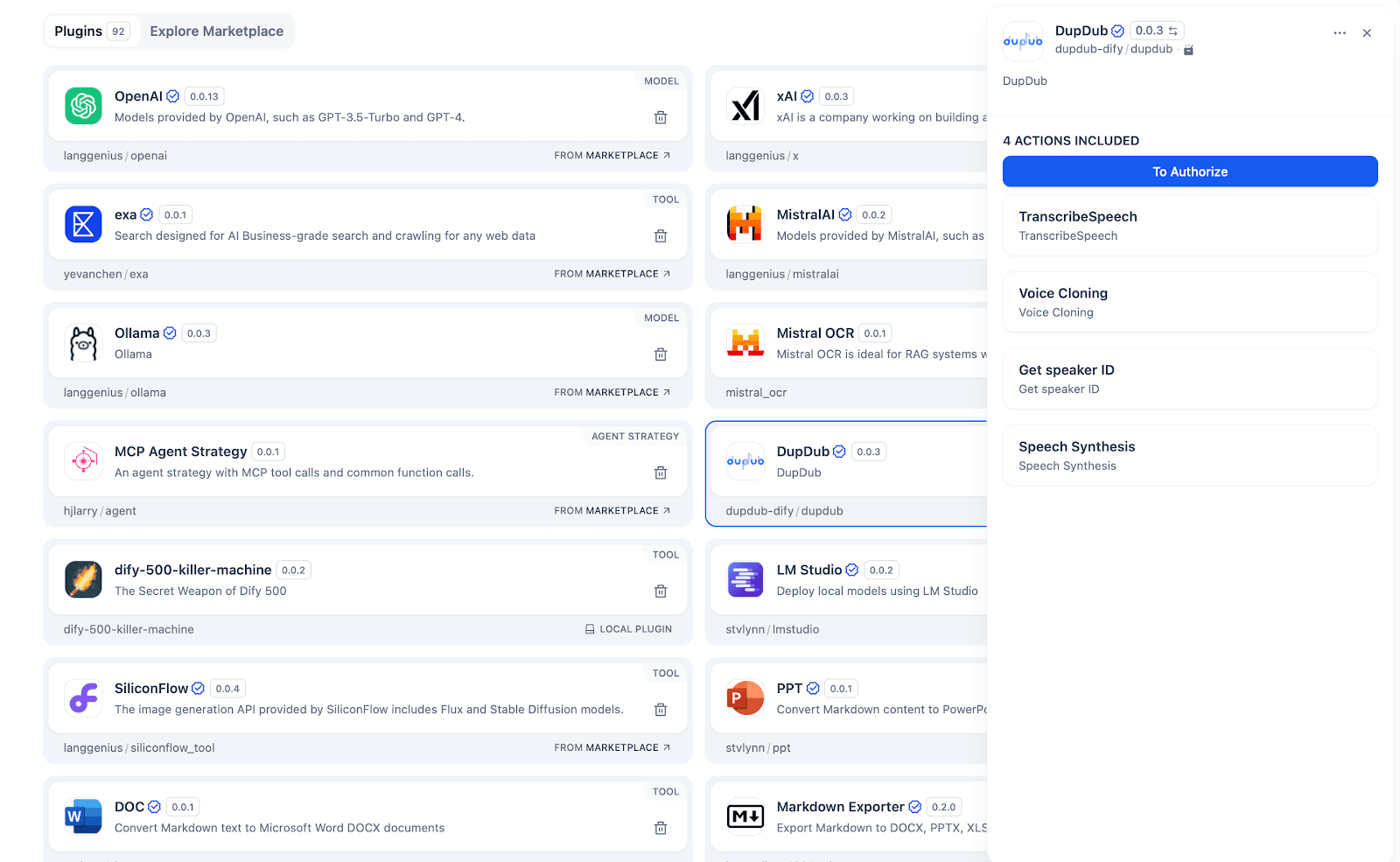 Launched alongside Dify v1.0.0, our Marketplace is rapidly growing into a vibrant ecosystem built upon our open-source AI application development platform. Hosting a diverse range of plugins like Models, Tools, Agent Strategies, Extensions, and Bundles, the Marketplace empowers Dify users to innovate and scale AI solutions faster. Its modular design makes it the ideal environment for integrating cutting-edge tools like those from DupDub, further enhancing the multi-modal capabilities available within the Dify community.