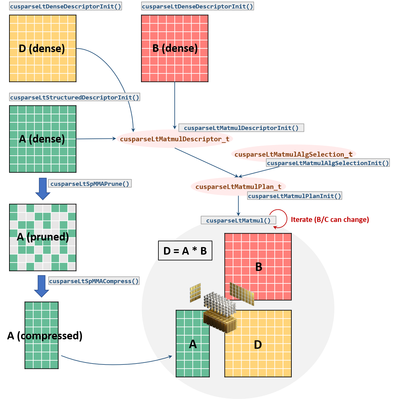 1. Initialize the library handle:cusparseLtInit().2. Specify the input/output matrix characteristics:cusparseLtDenseDescriptorInit(),cusparseLtStructuredDescriptorInit().3. Initialize the matrix multiplication descriptor and its properties (e.g. operations, compute type, etc.):cusparseLtMatmulDescriptorInit().4. Initialize the algorithm selection descriptor:cusparseLtMatmulAlgSelectionInit().5. Initialize the matrix multiplication plan:cusparseLtMatmulPlanInit().6. Prune theAmatrix:cusparseLtSpMMAPrune(). This step is not needed if the user provides a customized matrix pruning.7. Compress the pruned matrix:cusparseLtSpMMACompress().8. Compute the required size of workspace:cusparseLtMatmulGetWorkspace. Allocate a device buffer of this size.9. Execute the matrix multiplication:cusparseLtMatmul(). This step can be repeated multiple times with different input values.10. Destroy the matrix descriptors, matrix multiplication plan and the library handle:cusparseLtMatDescriptorDestroy(),cusparseLtMatmulPlanDestroy()cusparseLtDestroy().