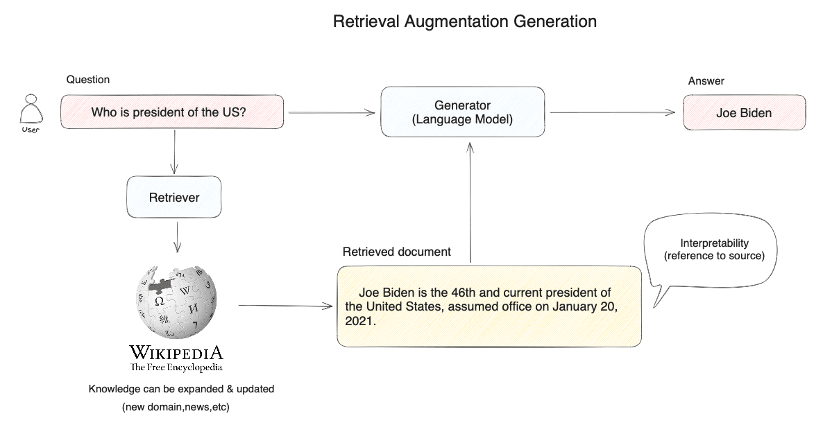 For example, as shown in the diagram, when a user asks, "Who is the President of the United States?", the system doesn't directly query the large model. It first conducts a vector search in a knowledge base (like Wikipedia), finds relevant information through semantic similarity (e.g., "Biden is the current 46th President of the USA..."), and then feeds the user's question and this retrieved information to the large model, enabling it to provide more accurate answers.