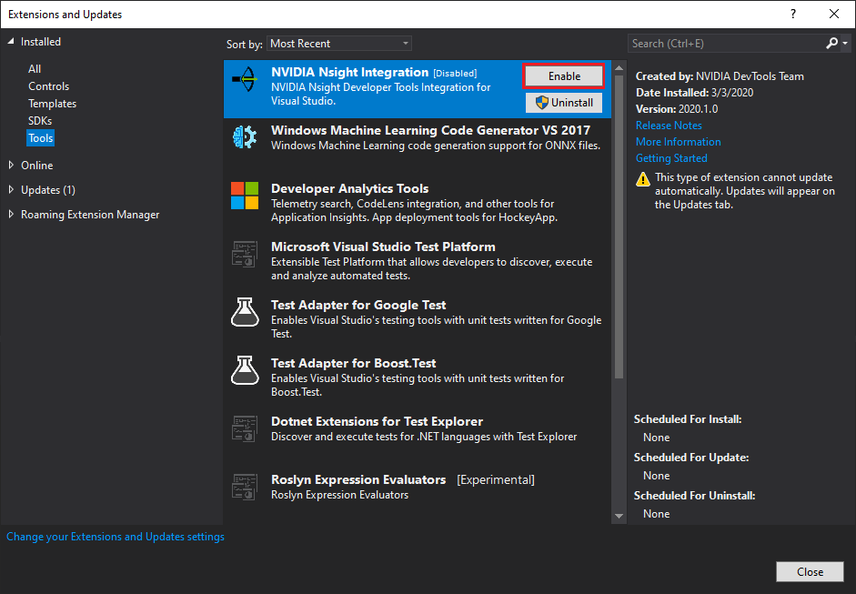 Use the Enable button to re-enable a disabled Nsight Visual Studio Extension. This will show the standalone tool menu items, so that these tools can again be launched from the Visual Studio Nsight menu. Note: Visual Studio will have to be closed and restarted for the changes to take effect. When enabling, give the Extension Manager several seconds to re-add the Nsight Integration Extension and the standalone tools to the Nsight Menu. Each version of Microsoft Visual Studio manages its own extensions. Disabling the NVIDIA Nsight Integration in one version of Visual Studio does not affect the NVIDIA Nsight Integration extension on other versions of Visual Studio on the same machine. Any installed participating tools will be found and shown by NVIDIA Nsight Integration once it is re-enabled. |