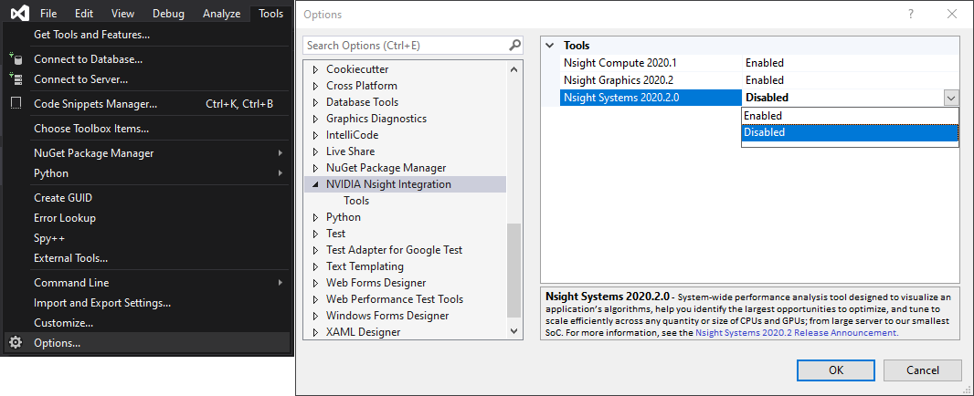 If a tool is installed, its visibility in the Nsight menu may be configured using the NVIDIA Nsight Integration options in the Extension Manager. (NOTE: these controls are not found under the Nsight menu's Options that appear when NVIDIA Nsight Visual Studio Edition is installed.)
