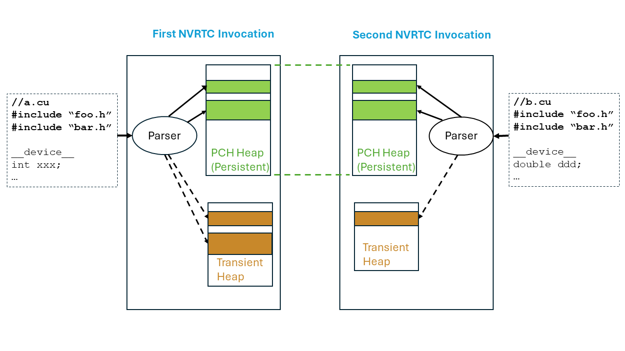 PCH files with “-create-pch=filename” and “-use-pch=filename” NVRTC flags, respectively.